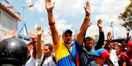 Auparavant, le cortège avait quitté la Place Venezuela, dans la zone centrale de Caracas, pour rejoindre le CNE, à l’appel d’élus estudiantins qui avaient pourtant présenté cette manifestation nationale comme non partisane. La majorité des participants arboraient des signes distinctifs des différents partis politiques qui soutiennent le candidat de l’opposition de droite, Henrique Capriles. Des jeunes de sa formation, Primero Justicia, ont même mis en scène la remise du prix du « sans gêne » à Nicolas Maduro, qu’ils accusent de mentir en matière de politique de sécurité. « Nous luttons contre quatorze ans d’abus de pouvoir, et d’intimidations, dit Luis Machado, venu de l’intérieur du pays. Comme lui, les manifestants exigent le changement du système électoral, entre autres, l’appareil captant les empreintes, qui évite pourtant d’usurper l’identité de l’électeur. « Nous exigeons l’impartialité des recteurs du CNE qui, nous le savons, sont engagés avec le candidat du gouvernement », critique Patrick de Jeunesse active Venezuela Unie. « Les universités sont unies pour la défense de la démocratie, la constitution, la souveraineté », estime Augusto de l’université des Andes. « Le gouvernement ne favorise que la tendance du PSUV et les intérêts des frères Castro », ajoute-t-il, reprenant ainsi le discours traditionnel de l’oligarchie réactionnaire vénézuélienne.