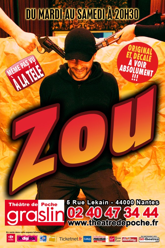 ZOU EST À NANTES DU 18 AU 29 SEPTEMBRE 2012 http://www.billetreduc.com/77190/evt.htm À BORDEAUX DU 30 OCTOBRE AU 3 NOVEMBRE 2012 http://www.billetreduc.com/77193/evt.htm IL SERA ÉGALEMENT LE 10 NOVEMBRE 2012 AU FESTIVAL DE LA QUEUE-LES-YVELINES (78) "SÉRIEUSEMENT DRÔLE", EN 2013 AU CAFÉ-THÉÂTRE LA BOITE À RIRE À PERPIGNAN (66) http://www.facebook.com/pages/La-Boite-%C3%A0-Rire-caf%C3%A9-th%C3%A9%C3%A2tre/144368068636?ref=ts À VENIR : FESTIVAL INTERCOMMUNHILARITÉ DE VENDEVILLE (59) ET AU FESTIVAL D’HUMOUR DE VIENNE (35), ET MOULINS (03), MAGNY LES HAMEAUX (78), FOUGÈRES (35), GRENOBLE (38), ...ETC.