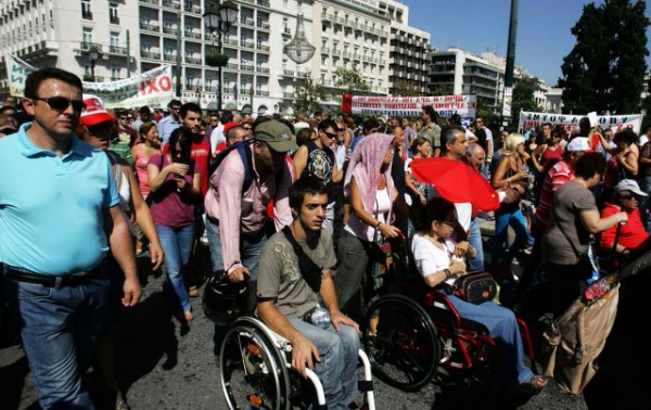 En Grèce le gouvernement coupe toutes les aides , Les personnes handicapées ne sont pas épargnées, Les personnes handicapées manifestent contre les mesures d’austérité pour protester contre la baisse de leur faible pension ; « nous n’avons que nos pensions pour vivre » « on se bat contre la baisse de nos faibles pensions » « Ce que le gouvernement fait on ne le voit nul part ailleurs » Pouvait on entendre lors de ces manifestations…