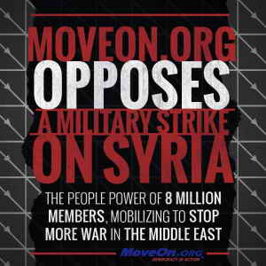 “MoveOn members, like the majority of Americans, oppose military intervention in Syria and want Congress to reject the Authorization for Use of Military Force resolution. Following MoveOn members’ overwhelming 73% vote to oppose the war, we are launching a major effort calling on Congress to vote ‘no’ on the President’s request for an Authorization for Use of Military Force in Syria.