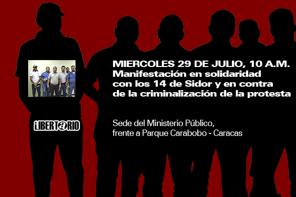 ¡Que la solidaridad no sea una palabra muerta! Invitamos a todos y todas a la manifestación en contra de la criminalización de la protesta y para rechazar cualquier condena contra los 14 de Sidor, este miércoles 29 de julio a las 10 de la mañana en la sede del Ministerio Público en Caracas, frente a la estación del Metro de Parque Carabobo. Esta es una manifestación autónoma de todos los partidos políticos e instituciones de poder, en el marco de la campaña por la defensa del derecho a la protesta social, promovida por organizaciones de abajo.