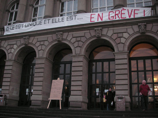 La politique de mise en concurrence des Universités trouve aujourd’hui sa première application dans l’U.D.S, première Université de France par sa taille, résultat de la fusion de trois universités. Lors de son inauguration par la ministre de l’a-culture Valérie Pécresse, elle était déjà en grève. La cérémonie a été dûment sabotée par professeurs et étudiants, ces derniers ayant fait l’objet d’une répression violente et immotivée des forces de l’ordre.