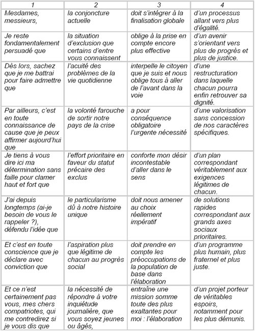 Camarades, la situation d’exclusion que certains d’entre vous connaissent a pour conséquence obligatoire l’urgente nécessité d’une restructuration dans laquelle chacun pourra enfin retrouver sa dignité. Je tiens à vous dire ici ma détermination sans faille pour clamer haut et fort que le particularisme dû à notre histoire unique doit s’intégrer à la finalisation globale de solutions rapides correspondant aux grands axes sociaux prioritaires.
