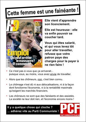 L’un des ressorts les plus puissants de la victoire idéologique de Sarkozy est maintenant bien connu. Cette analyse se retrouve chez PRS (on en a parlé), chez Lipietz (on n’en a pas parlé mais on l’a lu - bof) et même au PCF (si, si, il y en a qui pensent à autre chose qu’à la "recomposition") : Sarkozy a réussi à opposer les salariés (qui se lèvent tôt) aux "exclus" ou aux "assistés" (qui se couchent tard). En convaincant les premiers qu’il ne tenait qu’à eux de devenir riche, et que pour ça il fallait notamment arrêter de distribuer de l’argent aux seconds, les fainéants.