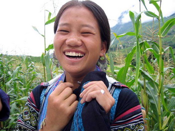 Á plus basse altitude, Cat Cat est un village H’Mong Noir situé dans une vallée au sud de Sapa. En y allant, on croise des H’Mong Noir marchant sur le bas-côté des chemins défoncés. Ils vont pieds nus, des pieds étonnement larges. L’eau marron des montagnes bleues arrive de partout autour de ce village composé de familles de la même lignée. Parfois, les nuages sont si bas qu’il fait presque nuit. Des habitants se lavent dans la rivière boueuse. Les maisons n’ont pas de fenêtre. Un enfant porte une hotte de tiges d’indigotier, pantalon à mi-mollets. Une vieille femme a de grandes boucles d’oreilles d’argent montées en jantes dans les trous élargis des lobes, si bien que ses lobes distendus rappellent des rondelles de calmar. Une mère et sa fille dans leur superbe tenue quotidienne sourient en ramassant le fourrage pour le buffle. Elles, comme souvent les Dzao Rouge, nous demandent de les photographier. Des papillons aux ailes grandes comme les deux mains tournent, partent et reviennent.
