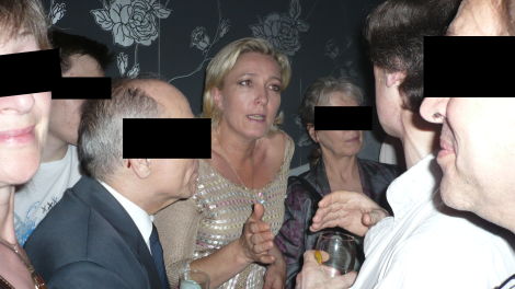 A notre entrée, on note qu’une femme blonde à la silhouette massive, de dos, focalise les regards. C’est Marine Le Pen, venue « en lectrice » du blog. On la laisse papoter avec ses admirateurs.