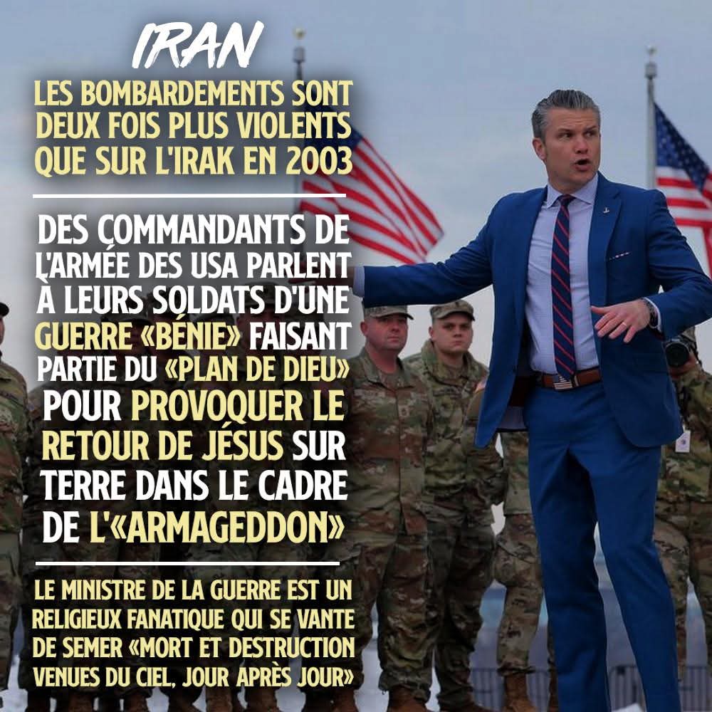 Derrière cette attaque de grande ampleur, une logique religieuse affolante. Des commandants de l’armée des USA ont déclaré à leurs soldats que la guerre contre l’Iran était une guerre Sainte faisant partie du « plan de Dieu », d’une guerre « bénie par Jésus » et qu’elle allait provoquer le retour du fils de Dieu sur Terre dans le cadre de « l’Armageddon ». Dans la Bible, l’Armageddon est la bataille finale entre le bien et le mal, les rois des hommes et Dieu, c’est-à-dire l’apocalypse. Incroyable mais vrai.