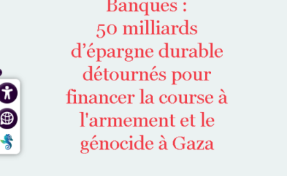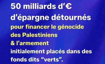 50 milliards d’€ d’épargne détournés pour financer l’armement et le génocide à Gaza, initialement placés dans des fonds dits “verts”. Greenwashing européen. Argent détourné de l’objectif initial de son investissement. Armement d’un (…)