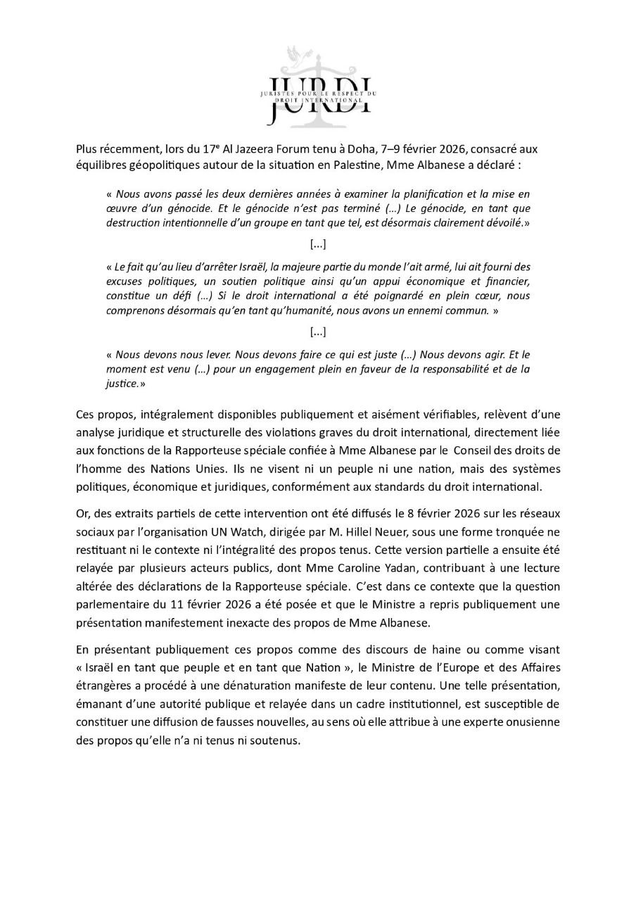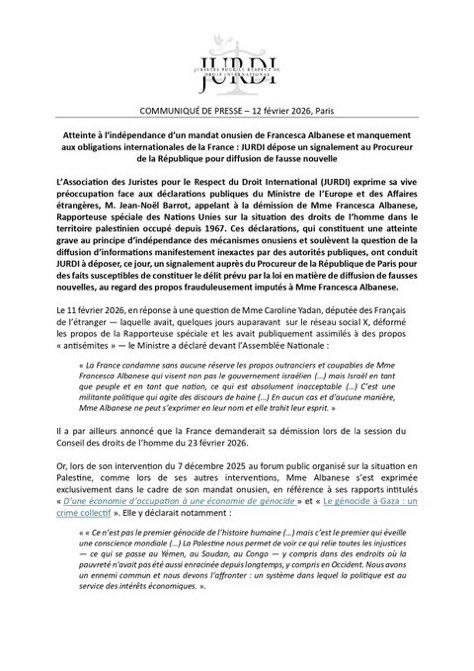 L’association des juristes pour le respect du droit international effectue un signalement au procureur pour "diffusion de fausses nouvelles" après que Jean-Noël Barrot Ministre de l’Europe et des Affaires étrangères ait humilié la France en appelant à la démission de Francesca Albanese sur la seule base des mensonges de la députée Caroline Yadan