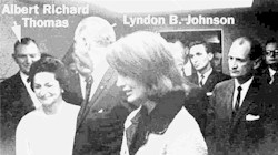 Le nouveau président Lyndon Johnson échange regards et sourires avec Le congressiste Albert Richard Thomas lors de as prestation de serment devant la juge Sarah Hugues et Jacqueline Kennedy. La veille de l’attentat, IL avait déclaré : « À partir de demain, ces maudits Kennedy NE seront plus un problème pour moi ».