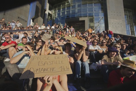 * Contrairement à ce qui se passe en Espagne, il n’y a aucune tente sur la place de la Bastille. Donc aucune installation, aucune « prise de la Bastille » ! Pour info, en 1789, les révolutionnaires prirent les armes, vinrent délivrer sept prisonniers et couper la tête au directeur de la prison d’Etat. Pas grand-chose à voir avec aujourd’hui, les mots ont un sens.