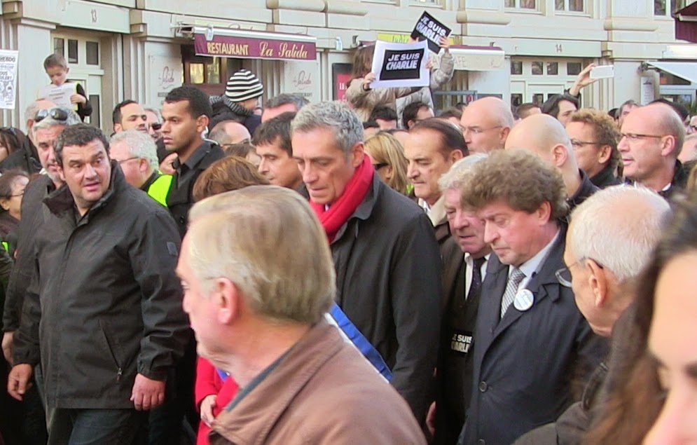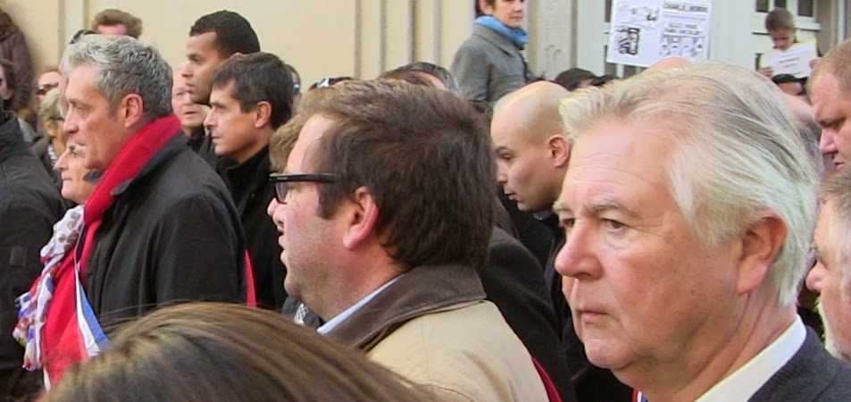 sont." (le même). Ensemble 34, c’est simple, s’extasie, en titre, sur "la marée citoyenne" et puis le soufflé retombe, le compte rendu est des plus factuels : du monde, des pancartes, ds applaudissements... mais il est noté, quand même, qu’il y avait " dans le cortège, de la gravité, de la sérénité, ponctuée par des applaudissements nourris". De la psychologie, pas de la politique... C’est en retrait de Mélenchon mais à Ensemble on en est satisfaits : "Pas de slogans ni banderoles". Visiblement c’est bien. Tout juste "quelques drapeaux tricolores". Ah bon. Et alors ? Eh bien, on nous dit qu’ils étaient "en deuil ou non". Tiens donc... Question perfide : c’est pas un brin "slogan et banderole", le bleu, blanc, rouge ? Mais l’important est évidemment ailleurs, dans les "cartons "je suis Charlie", des unes de Charlie Hebdo, des pancartes appelant à la tolérance et au rejet de la haine"... Bref à Ensemble on n’a pas l’air plus gêné que ça de nous relayer que le bon peuple a aujourd’hui parlé d’une voix avec Hollande, Valls, Merkel, Netanyahu, Orban... Et ici avec Saurel, Grand, Domergue, le préfet... Le PS, l’UMP... La tolérance, le rejet de la haine... ils disent aussi. Quant à ce qu’ils/elles font...Une mention sur le PC : Laurent, sans surprise, "a foncé tête baissé dans le panneau" et a été pleinement au diapason du gouvernement. Sans surprise, n’est-ce pas ?