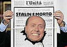 Berlusconi, en bombant le thorax et les joues, au risque de faire crouler son lifting, déjà précaire, s’est saisi d’une vielle première page de L’Unità, de 1953, où on donnait la nouvelle de la mort de Staline et, en l’agitant, a déchaîne sa haine en s’adressant a la journaliste de L’Unità : "Vous devriez avoir honte ! Vous vous déclarez complice de cent millions de meurtres, je crois qu’il n’y a aucune possibilité d’un changement de votre attitude préjudiciable et je ne viendrai donc pas chez vous pour essayer de vous convaincre : c’est impossible".