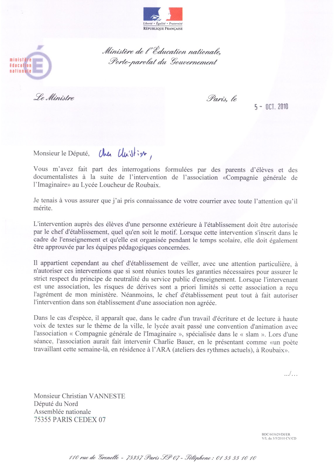 On ignore quelles suites seront données à cette affaire au LP Louis-Loucheur - la lettre du ministre à Christian Vanneste est en date du 5 octobre - mais d’ores et déjà, le recteur de l’académie de Lille a fait savoir à tous les responsables d’établissements scolaires que la Générale de l’imaginaire est désormais persona non grata dans l’Éducation nationale. Slameur, le ministre, mais pas trop..."