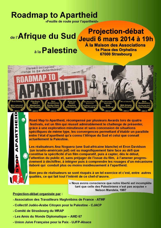 Publie le jeudi 13 février 2014 par Campagne BDS France - Open-PublishingFilm-débat que le CJACP, l’ATMF, l’UJFP et les AMD 67 organisent le jeudi 6 mars à Strasbourg, dans le cadre de la semaine contre l’apartheid israélien.