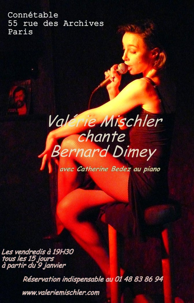 De plus, dans la querelle des anciens et des modernes, sur la chanson de création, et la chanson du répertoire, Valérie Mischler offre un voyage dans l’oeuvre de Bernard Dimey, entre poèmes voyous et lettres d’amour et de fraternité cabossée du côté de la rue Lepic, et autres mondes des paumés de la vie, truculents , hâbleurs, buveurs et adeptes du sirop de la rue.