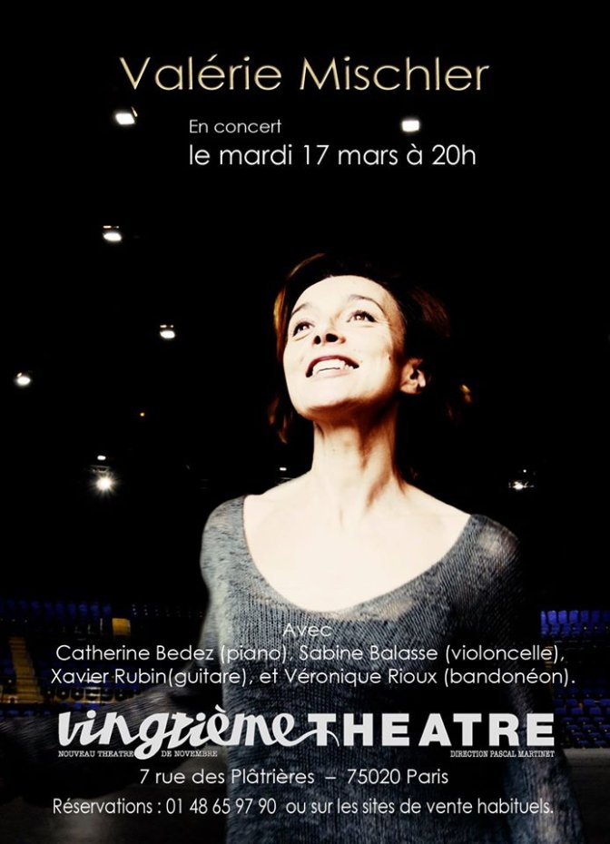 Pour les réservations, voyez ICI. http://www.vingtiemetheatre.com/valerie-mischler/