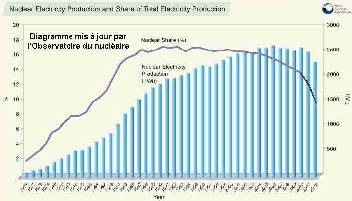 Publie le mardi 11 mars 2014 par OBSERVATOIRE du NUCLEAIRE - Open-PublishingLa part du nucléaire dans l’électricité mondiale est