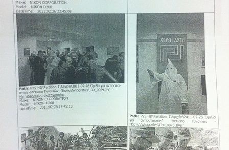 Des clichés montrent aussi le porte-parole du parti Ilias Kasidiaris maniant des armes, dont une kalachnikov, ou effectuant le salut nazi aux côtés d’autres militants. Dans les pièces d’instruction diffusées par la presse apparaissent également des photos de membres vêtus de cagoules semblables à celles du Ku Klux Klan, des photos de "cours" dispensés à de jeunes enfants, un "serment" d’entrée dans le parti par lequel l’impétrant promet de "tuer le juif qui est en (lui)".