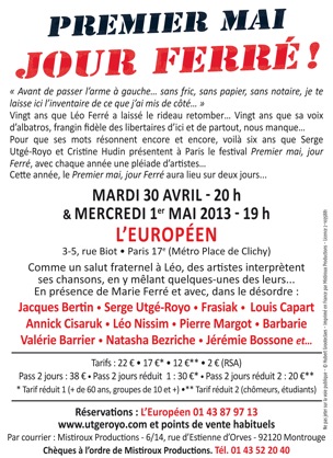 Au bonheur des interprètes … Depuis 20 ans Léo Ferré réunit chaque année la fine fleur de la scène, interprètes et auteurs/compositeurs qui explorent le plus extraordinaire répertoire de la chanson contemporaine. Ce furent d’abord les 10 années de Thank You Ferré, chaque 14 juillet, pour un défilé qui n’avait rien de militaire, c’était scène ouverte aux artistes de bonne volonté venant saluer le maître. Et rendre hommage. Voici maintenant les Jours Ferré, depuis 7 ans, deux soirées exceptionnelles, le 30 avril et le 1 er mai.