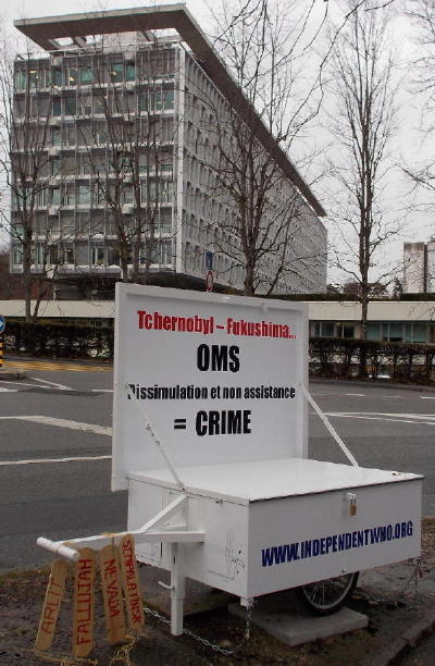 La politique de l’OMS concernant les victimes de la pollution radioactive de Fukushima est analogue à celle menée pour Tchernobyl : le déni. Ainsi le 20 mars dernier, le paysan japonais Naoto Matsumura s’est joint aux vigies d’Hippocrate devant le siège de l’OMS comme l’avait fait le Maire de Futaba en 2012. Tous deux dénoncent également les mensonges de l’OMS concernant la situation sanitaire à Fukushima et son crime de non-assistance. Cette position de l’OMS en matière de radioprotection tient à un conflit d’intérêt qui la lie à l’Agence internationale de l’énergie atomique (AIEA) dont le rôle est la promotion du nucléaire. Dans l’accord que ces deux agences ont signé le 28 mai 1959, il est notamment stipulé : « L’Agence internationale de l’énergie atomique et l’Organisation mondiale de la santé reconnaissent qu’elles peuvent être appelées à prendre certaines mesures restrictives pour sauvegarder le caractère confidentiel de renseignements qui leur auront été fournis... » (Voir http://independentwho.org/fr/accord-wha12-40/ )
