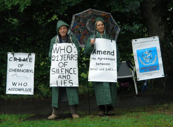 Depuis le 26 avril 2007, les Vigies d’Hippocrate du Collectif international IndependentWHO – Santé et Nucléaire manifestent silencieusement tous les jours ouvrables de 8h à 18 h devant le siège de l’Organisation mondiale de la santé (OMS) à Genève. Ces personnes témoignent depuis sept ans pour les victimes de la pollution radioactive de Tchernobyl et autres sites contaminés dans le monde (2020 essais nucléaires, bombardement aux armes à uranium appauvri, etc.) et pour les victimes plus récentes de Fukushima. Elles dénoncent le fait que l’OMS ment au sujet de la situation sanitaire des populations affectées et ne leur porte pas assistance.