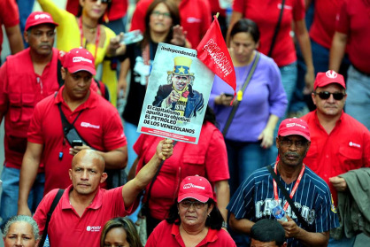 Mardi 18 février à Caracas : mobilisation pacifique d´étudiants et de travailleurs pétroliers pour défendre le verdict des urnes et la poursuite du programme socialiste. A cette occasion, Nicolas Maduro (de dos) a signé le nouveau contrat collectif en faveur des travailleurs de ce secteur (dont les États-Unis cherchent précisément à reprendre le contrôle via la tentative de coup d’État).