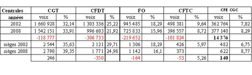 La CGT une perdante et gagnante à la fois, qui récolte 246 sièges supplémentaires, au moment ou elle maigrie de 118 777 voix ! L’effondrement de la Cfdt en perte exprimée de près de 23% de ses votants et en sa défaveur depuis 2002 plus de 300 000 voix perdues ! Et un unique et réel sursaut du club des 5, venant de la centrale à cadres, qui elle recueille + 14 376 voix.