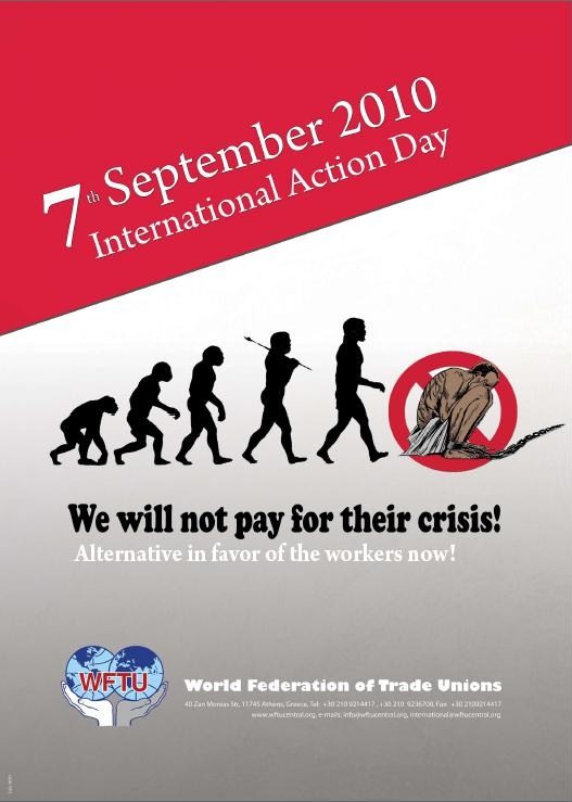 La Fédération Syndicale Mondiale –FSM- appelle le mouvement syndical et les organisations progressistes du monde à agir en se joignant à nous le 7 Septembre 2010 pour participer à cette journée d’action.