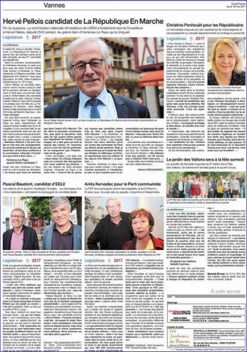 Chez moi, la feuille de chou régionale, celle que mes voisins vont chercher de bon matin dans leurs boîtes aux lettres, s’appelle Ouest-France. La page locale sur Vannes de Ouest-France vient donc de présenter les listes de candidats aux législatives pour ma circonscription :