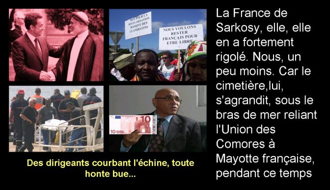 La France de Sarkosy, elle, elle en a fortement rigolé. Nous, un peu moins. Car le cimetière, lui, s’agrandit, sous le bras de mer reliant l’Union des Comores à Mayotte française, pendant ce temps. Pour qui oublie que l’économie comorienne a longtemps été entre les mains de l’occupant, avant de s’effondrer telle la baudruche des lendemains de fête de plantation, la perspective de louer Maore aux Français pourrait paraître intéressante, d’autant plus que nous devinons ce que les Mahorais, peuple en souffrance suite au trop plein de Comoriens transplantés dans ses veines, ne savent qu’à demi mots. La France, contrairement à tout ce que l’on a raconté jusqu’alors, se fait des couilles en or, soyons vulgaires jusqu’au bout, en demeurant le seul maître de ce poste avancé de la mer indianoceane. Nous pourrions parler de sa centrale d’écoute, classée secret-défense, et sur laquelle aucun fouille-merde, dût-il s’appeler Pierre Caminade, militant français du droit des peuples à disposer d’eux-mêmes, n’aurait le droit d’aligner une question. Pour dire le fond de la chose, les Mahorais ne savent pas à quelle sauce on les mange sur la Petite-Terre. Toutefois, ils sont loin d’être fous. Ils exigent les avantages de la soumission. Car ils imaginent bien que la France ne continuerait pas à battre ses cartes diplomatiques sur ce bout d’archipel sous contrôle sans raisons. Il savent qu’il existe un enjeu supérieur à tous les autres, même s’ils ne le ne maitrisent pas, qui explique ce viol d’une terre insulaire. Ils reconnaissent leurs limites là où l’adversaire colonial rabat les cartes avec agilité et rouerie, et exigent en échange de leur mutité surfaite un bon paquet d’euros à dépenser dans le consumérisme le plus baroque.