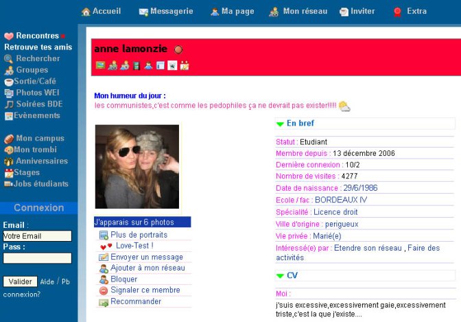 Une de leur jeune militante, Anne Lamonzie, n’a visiblement pas eu la fête bien joyeuse...pour s’égarer à ce point dans sa citation de haute volée ("Les communistes c’est comme les pédophiles ça ne devrait pas exister.") qui est tragique, stigmatisante, méprisante et inutilement virulante..à l’égard de nos camarades, militants ou sympathisants communistes..qui méritent le respect, la considération pour leur engagement et leurs convictions personnelles.