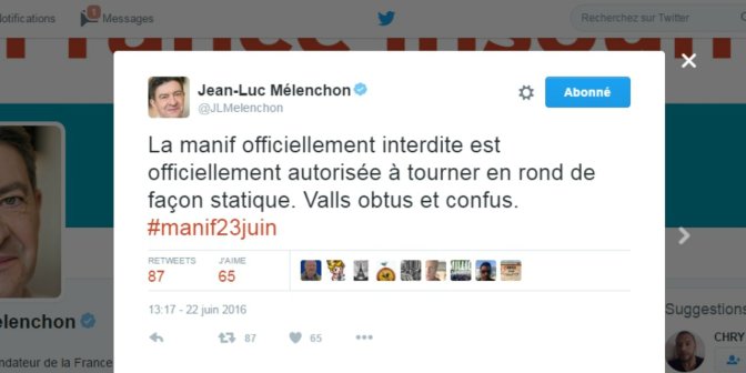 Publie le mercredi 22 juin 2016 par Jean-Luc Mélenchon - Open-PublishingLa manif officiellement interdite est officiellement autorisée à tourner en rond de façon statique. Valls obtus et confus