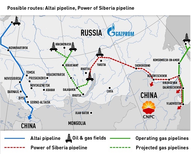 Dans les négociations de l’accord gazier avec la Russie, la Chine appelle à un nouveau gazoduc, le pouvoir de l’oléoduc Sibérie pour être en parallèle avec la Sibérie orientale - océan Pacifique ligne sur la carte. Il peut y avoir un problème sur qui va payer pour la ligne, et si un paiement initial de la Chine sera nécessaire.