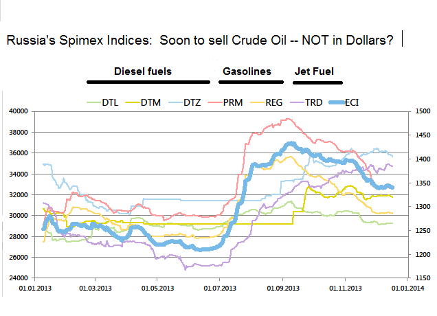 St. Petersburg International Mercantile Exchange de RUSSIE, spimex est la plus grande bourse de marchandises en Russie, en organisant des échanges de biens réels et de contrats à terme. (Les contrats à terme pour la livraison des marchandises dans l’avenir plutôt que le mois prochain ou "sur place," en ce moment. Si la livraison entraînerait une perte financière pour l’une des parties, qui peuvent régler en payant la perte de l’autre.) Basé sur les transactions au cours de la négociation, l’international de Saint Pétersbourg Exchange calcule et publie tous les jours des « indices » de produits raffinés comme le montre le graphique de ACCCOMPANYING. L’indice, comme Dow-Jones des stocks, est sans dimension, pas en dollars ou en toute autre monnaie, mais un certain nombre "pur" calculé ainsi : http://spimex.com/upload/presentati ... .
