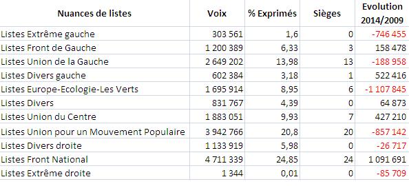 Perte de 746 455 voix -------> - 79,09 % de voix entre 2009 et 2014