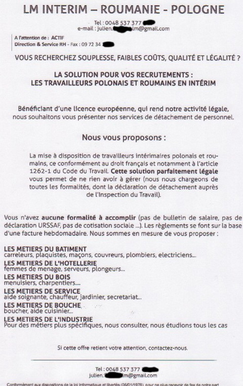 Voilà donc ce que des patrons gaulois de souche et patriotes peuvent recevoir dans leurs boîtes aux lettres, sans que leurs organisations syndicales (qui ont portes ouvertes chez François II) ne s’en émeuvent. En plus du bénéf assuré sur le fameux "coût du travail", les contrats de travail sont de l’intérim pur et dur : le dernière classe des exploités avant les sans-emploi.