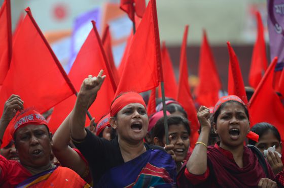 Dans le monde on constate des grèves au Cambodge où la police avait tiré en janvier 2014 sur les ouvriers du textile en grève, trois morts !