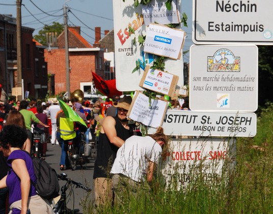 Ouvert par un tracteur et des caddies sur lesquels on pouvait voir des pancartes « Occupy Mulliez » ou « Decathlon, à fond l’béton », un cortège coloré de plus de deux cents personnes s’est ensuite ébranlé en direction de Néchin (commune belge d’Estaimpuis), où résident plusieurs membres de la famille Mulliez. La traversée de la rue de Lannoy, commerçante et populaire, a permis de recueillir l’expression du soutien des commerçants et des habitants. Le nombre important d’entreprises détenues par la famille Mulliez a permis aux marcheurs de donner libre cours à leur imagination pour la confection de pancartes : « Kiabi, la mode mais à quel prix ? », « Les trois brasseurs... de pognon », « Des terres pas des hypers » ou encore « Immochan, non. Hymne aux champs, oui ».