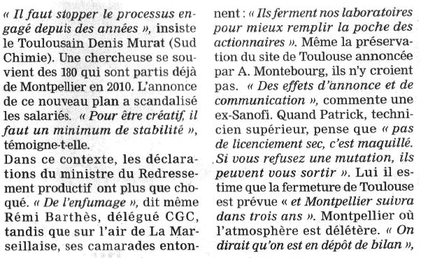 Publie le vendredi 12 octobre 2012 par Antoine (Montpellier) - Open-PublishingLes Sanofiens le disent clairement : pas de licenciements...ni secs (sic) ni ...mouillés !