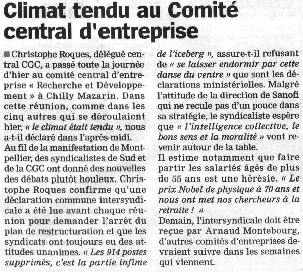 Lire à ce sujet : "Sanofi, une restructuration sous haute tension", Le Monde du 03 octobre 2012