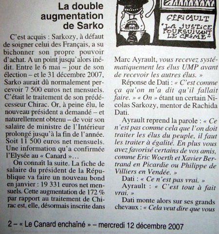 Dans son édition du mercredi 12 décembre 2007, le Canard Enchaîné publie une brève explosive. On sait que Nicolas Sarkozy a obtenu une augmentation de salaire de 172% il y a quelques semaines en demandant l’alignement de sa rémunération sur celle du Premier ministre. Ainsi, le chef de l’Etat percevra un salaire mensuel de 19 331 euros net. Mais cette augmentation ne sera effective que le 1er janvier 2008. D’ici là, le chef de l’Etat est censé percevoir le même salaire que celui de son prédécesseur, soit 7 500 euros net. Or, Nicolas Sarkozy a demandé à continuer de percevoir son salaire de ministre l’Intérieur jusqu’au 31 décembre 2007, soit 11 500 euros net.
