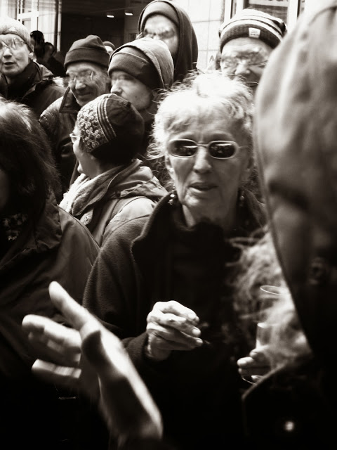 En cortège, nous nous rendons devant la porte du greffe et nous attendons. Chant, humour. Une camarade violoniste qui joue.