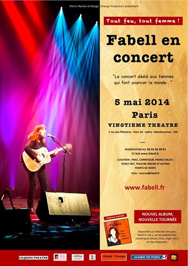 C’est lundi 5 Mai au Vingtième Théâtre, "Tout feu tout femme" Fabell (Fabienne Elkoubi) dans son spectacle dédié aux femmes remarquables, conseillé à tous les humains de bonne volonté, de tous les âges, de tous les sexes, de toutes les couleurs, de tous les pays, d’Orient ou d’Occident, Talisma, Angela, Rosa Parks, FannieLou, Mona Lisa, mais aussi grand père Win Tin et Zarganar... de Rangoon à Bogota... Il y a du blues, du flamenco, de la musique de tous les pays dans la voix de Fabell. Il y a un album récent,