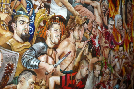 « Drôle et gore », estime le peintre, Baptiste Folliot. Ici, les gens fustigent la « propagande médiatique » et le « divertissement de masse », qui « endorment la population ».