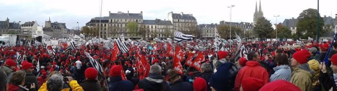 A ceux qui disent que tous les bonnets rouges défendent l’agroalimentaire, le patronat et les paysans accrocs à la monoculture et gavés de subventions, NON. Avec mes camarades nous étions de ces manifestants hostiles à ces façons de produire, mais nous avons vu qu’il faut faire une différence entre le court et le long terme. Nous étions mobilisés samedi car il y a des milliers de travailleurs qui vont perdre leurs emplois en Bretagne, des familles entières qui vont plonger dans la misère. Il y a une véritable urgence sociale, l’écotaxe n’en est pas la responsable mais elle ne va faire qu’accentuer ce phénomène. A long terme nous sommes nombreux à réclamer une autonomie politique et économique locale pour tourner la page de ce système capitaliste destructeur en vie humaines et en richesses naturelles. C’est évidement à long terme pour cela que nous nous battons, hier à Quimper et demain de nouveaux aux côtés des zadistes de Notre Dame des Landes, comme de nombreux bretons de gauche. Mais à court terme nous refusons de voir des milliers de travailleurs, qui triment au quotidien, être condamnés à la misère, c’est avec ces gens là que nous sommes allés manifester samedi, pas aux cotés du patronat.