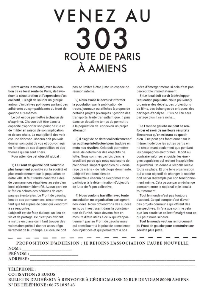 Nous vous invitons à participer à l’animation du local que nous venons de louer au 303 route de Paris à Amiens (voir l’article au dos). Nous souhaitons en faire avec vous un lieu de réflexion collectif qui permettra de prolonger la dynamique créée lors de la campagne des municipales