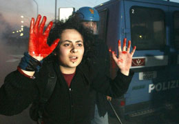 Il corteo lascia il centro della città alle spalle. Via Mattei è uno stradone, con la campagna intorno. In testa, principalmente padovani e bolognesi, che governano il faccia a faccia con la polizia che sbarra la strada. Tre file di cordoni, tutti i partecipanti invitati a rimanere dietro, prima fila che si barrica dietro ai cartelloni e avanza compatta. Dall’altra parte, scudi in vista, manganelli in mano e caschi in testa. Parte la carica. Qualcuno si fa male sul serio. La polizia ferma cinque persone. Ormai è sera. Dal camion del Tpo si invita alla calma. La trattativa si concentra sul rilascio dei fermati. Alla fine c’è la liberazione, sotto il flash dei fotografi. Qualcuno si arrabbia perché avrebbe voluto «sfondare». Invece si torna indietro al grido «dove non passeremo noi, non passerà più nessuno». E’ il via libera per piantare i tre cartelli che bloccano la strada. Poi si torna a casa e ci si guarda in faccia: «E’ andata bene, no?», «E io che non ci credevo...» -www.ilmanifesto.it