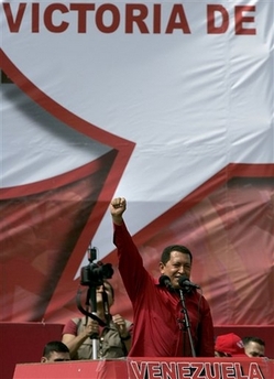 Venezuelan President Hugo Chavez sings the national anthem during an reelection campaign rally in Caracas, Venezuela, Sunday, Nov. 26, 2006. President Hugo Chavez holds a wide margin over his main challenger as he seeks a third term in Dec. 3 elections, according to an AP-Ipsos poll that also revealed many government opponents are worried they could face reprisals for how they vote. (AP Photo/Fernando Llano)