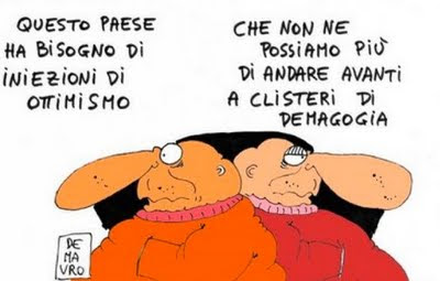 Sappiamo di nuovo che loro "vinceranno di certo", perché diminuiranno le tasse "in modo epocale" e lo faranno prima dell’estate chiedendoci sacrifici per altri 40 miliardi di euro di tagli, riformeranno la Giustizia togliendo la bilancia da ogni statua davanti ai Tribunali e Procure, modificheranno la Costituzione cominciando dal non giurarci più sopra, rinnoveranno ancora di più la Scuola Pubblica e al posto del Maestro Unico introdurranno il Mezzo Maestro per più classi contemporaneamente, daranno una regolata all’informazione con una serie tosta di editti bulgari…